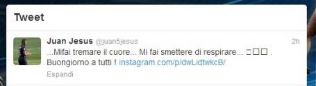 INTER JUAN JESUS SEMPRE PIU’ TIFOSO / MILANO – Juan Jesus è sempre più tifoso e sempre più innamorato dell’Inter. Su ‘Twitter’ il difensore brasiliano ha postato sul suo profilo una frase che già era stata usata dai tifosi dalla coreografia della curva nell’ultimo derby con il Milan; il brasiliano ha postato una sua foto con queste parole: “…Mi fai tremare il cuore… Mi fai smettere di respirare…. Buongiorno a tutti!”.