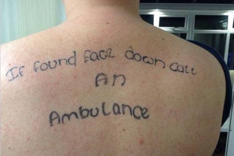 FOTO NEWS RAGAZZO UBRIACO SI RISVEGLIA IL MATTINO DOPO CON QUALCOSA IN PIU’ / LONDRA (Inghilterra) – Esagerare con l’alcol è pericoloso e può portare conseguenze più gravi di un mal di testa il giorno seguente. Ne sa qualcosa Josh, ragazzo inglese di 24 anni, che ad una festa a casa dell’amico Rob era ubriaco a tal punto da non accorgersi di essere stato denudato e, soprattutto, che gli era stato fatto un tatuaggio sulla schiena che riportava la scritta ‘Se trovato faccia a terra chiamate un’ambulanza‘ come potete vedere nella foto qui sopra. Josh se ne è accorto soltanto il mattino seguente a casa sua quando si è guardato allo specchio: la sua compagna, vedendolo, è letteralmente impazzita. Ma perché questo scherzo? Rob ha spiegato che si è trattato di una vendetta per un tatuaggio che Josh gli aveva fatto tempo prima su una gamba e che era venuto malissimo: doveva essere una lucertola e invece è venuta fuori soltanto una macchia. I due sono comunque rimasti amici, ma si sono promessi che se uno sarà ubriaco, l’altro non ne approfitterà…