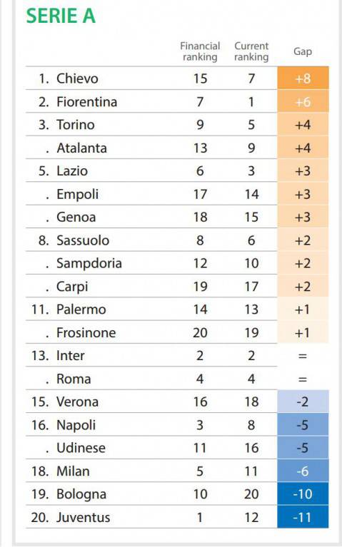 FOTO CIES INTER JUVENTUS / NEUCHATEL (Svizzera) – Il bello del calcio è che non è detto che chi spende di più vince. Ne sanno qualcosa i vari ‘Paperoni’ che nell’ultimo decennio hanno investito i loro soldi nello sport più amato al mondo. L’Osservatorio del Calcio del Cies (Centre International d’Etude du Sport) ha messo in relazione le spese sostenute dai club con i risultati ottenuti sul campo ed ha stilato la classifica che vedete in alto e che prende in considerazione il ranking finanziario in base alle spese per i cartellini dei giocatori di ogni squadra e la classifica del campionato di Serie A. La formazione che sta facendo meglio in base a questi parametri è il Chievo, seguito dalla Fiorentina e quindi dal Torino. L’Inter si attesta in tredicesima posizione, ma con un saldo neutro: seconda nel Financial Ranking e seconda in campionato. Male le altre due storiche big: il Milan è terz’ultimo con un saldo di -6, mentre la Juventus è addirittura ultima con -11.