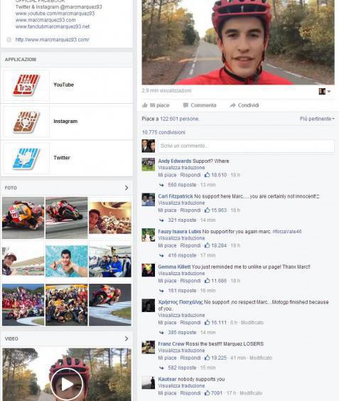 FOTO FACEBOOK MARQUEZ ROSSI / BARCELLONA (Spagna) – Non si spegne la polemica tra Marc Marquez e Valentino Rossi dopo i fattacci dell’ultimo gran premio di MotoGP. E dopo che il ‘Dottore’ ieri ha ringraziato i suoi fan su Twitter per il supporto annunciando di andare a Valencia, lo stesso ha voluto fare il pilota spagnolo con un video sul proprio profilo Facebook intitolato “Grazie per il supporto”. Un gesto che si è ritorto contro lo stesso Marquez: la stragrande maggioranza dei commenti dei fan (peraltro non italiani) si è infatti schierata con Rossi. Ecco i commenti meno offensivi:
