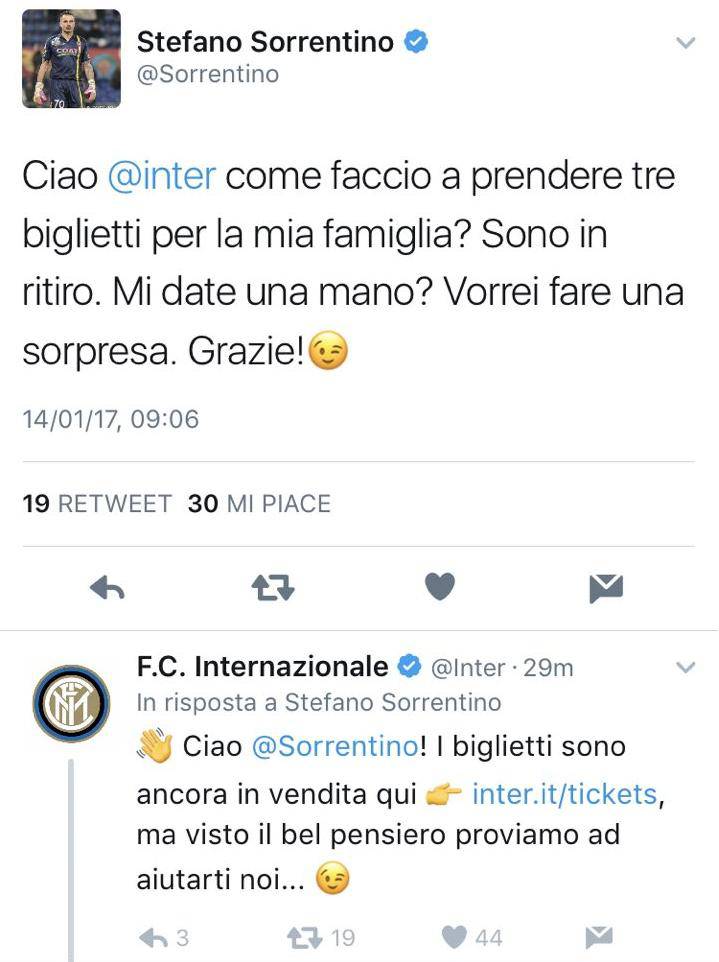 SORRENTINO INTER TWITTER / Il calcio, dopo tutto, è un gioco e non va preso troppo sul serio. Ecco perché fa davvero sorridere il simpatico siparietto andato in scena su Twitter (vedi foto in basso) tra il portiere del Chievo Stefano Sorrentino- avversario questa sera a ‘San Siro’ dell’Inter – ed il club nerazzurro. “Ciao Inter come faccio a prendere tre biglietti per la mia famiglia? Sono in ritiro. Mi date una mano? Vorrei fare una sorpresa. Grazie!” ha scritto sul suo account ufficiale l’estremo difensore gialloblu. Pronta la risposta da parte dei meneghini: “Ciao Sorrentino! I biglietti sono ancora in vendita qui http://inter.it/tickets , ma visto il bel pensiero proviamo ad aiutarti noi…”. Un clima sereno che ci si augura possa proseguire anche in campo.