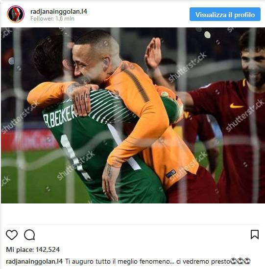 Come si è soliti fare ormai da qualche anno, i calciatori salutano gli ex compagni di squadra attraverso una foto su Instagram. E’ quello che ha fatto anche Nainggolan, che ha mandato un messaggio ad Alisson, portiere brasiliano che da ieri è ufficialmente un giocatore del Liverpool. “Ti auguro tutto il meglio fenomeno… ci rivedremo presto”. Nella conversazione si è però intromesso un tifoso della Lazio, il quale ha invitato il ‘Ninja’ a seguire il suo ex compagno alla Roma: “Vacci pure tu almeno vinci qualcosa”. Pronta la risposta del belga: “Anche quest’anno c’eri quasi” ha scritto riferendosi alla qualificazione in Champions sfumata all’ultima giornata proprio contro i nerazzurri!
