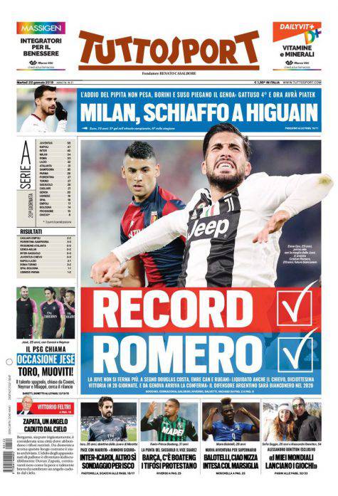 Rassegna stampa: i titoli sull’Inter di ‘Tuttosport’ di oggi, martedì 22 gennaio 2019.