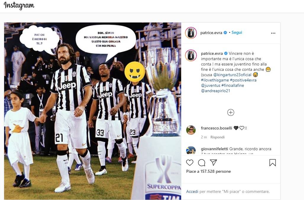 Dopo la pessima prestazione in Champions League contro il Real Madrid, Arturo Vidal è tornato a giocare su discreti livelli domenica contro l’Atalanta. Anche se sulla sua prova grava l’errore a tu per tu con Sportiello che avrebbe potuto portare l’Inter sul 2-0. Alle critiche di buona parte dei tifosi nerazzurri si sono aggiunti gli sfottò e le frecciate di quelli della Juventus. In particolare ha fatto rumore il post su Instagram di Patrice Evra: l’ex terzino francese ha pubblicato una vignetta (vedi sotto) con Pirlo che gli chiede chi è il calciatore che lo segue e lui risponde: “Boh… Se non ho perso la memoria maestro, questo qua giocava con noi prima”. Per tutte le altre news sull’Inter CLICCA QUI. Evra ha anche aggiunto il commento: “Vincere non è importante ma è l’unica cosa che conta! ma essere juventino fino alla fine è l’unica cosa che conta anche (scusa Arturo Vidal)”. Sebbene sia stato taggato, il mediano cileno non gli ha risposto.