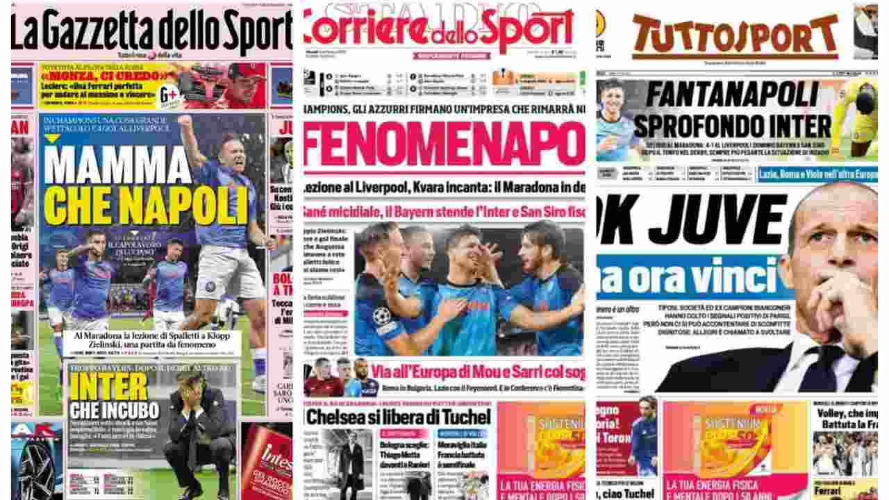 GAZZETTA DELLO SPORT – “Inter che incubo. Troppo Bayern: dopo il derby altro ko”. “TROPPO BAYERN, INTER CROLLA. Sane è imprendibile, altro ko dopo il derby. Europa subito in salita”. “Braccio in area di Skriniar: tocco fortuito non è rigore”. “Onana reattivo e fortunato, Kimmich è l’anima”. “INZAGHI, UN’ALTRA LEZIONE: Che forti loro… e che errori noi! Sì, la mia Inter poteva fare di più”. “ONANA: Scavalcato Handanovic. Estro e coraggio ma anche un brivido”. “Ahi D’Ambrosio: sesto autogol Inter in Champions”.