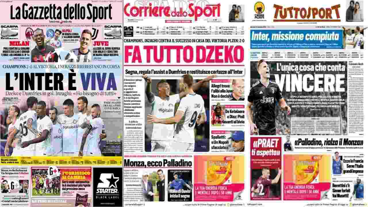 GAZZETTA DELLO SPORT – “L’INTER E’ VIVA: Dzeko e Dumfries in gol. Inzaghi: Ho bisogno di tutti”. “FINALMENTE UNA BELLA VIKTORIA. L’Inter domina a Plzen, Dzeko un gol e un assist, Dumfries chiude la gara”. “Bucha sulla tibia di Barella: giusto il rosso (al monitor)”. “Le Pagelle: Acerbi, esordio coi fiocchi. Dumfries va veloce”. “INZAGHI, LA SCELTA E’ GIUSTA. Simone fa turnover, Lautaro in panchia: Ho bigosno di tutti”. “Dzeko leader a sorpresa: Avanti così tutti insieme”. “Bergomi: Acerbi bene, ma ora l’Inter deve ritrovare il vero Barella”.